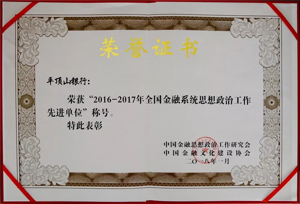 大河网讯 近日,中国金融思想政治工作研究会、中国金融文化建设协会联合表彰“2016-2017年全国金融系统思想政治工作先进单位和先进工作者”,平顶山银行荣获“2016-2017年全国金融系统思想政治工作先进单位”荣誉称号。