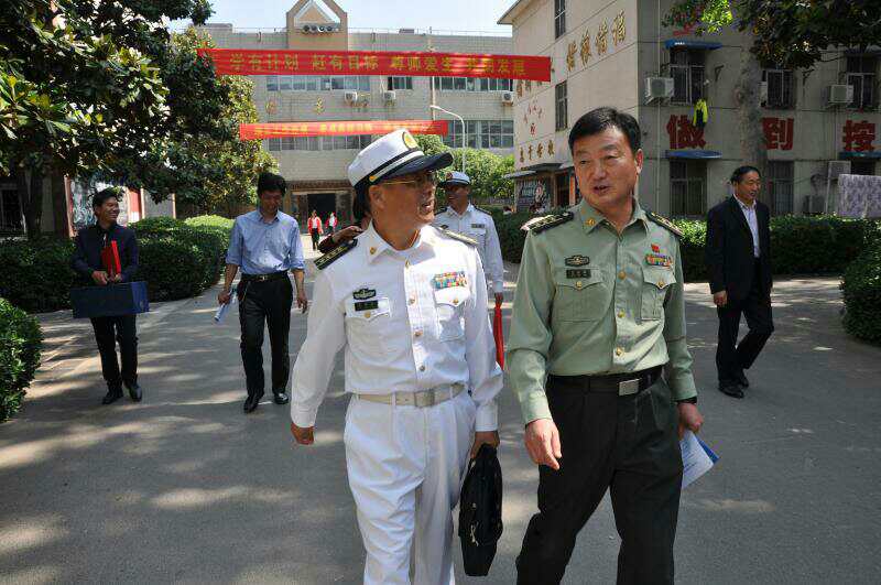 中国人民解放军海军工程大学马明田大校与杞县县委常委、人武部政委王怀军走进杞县高中校园内开展征兵宣传工作