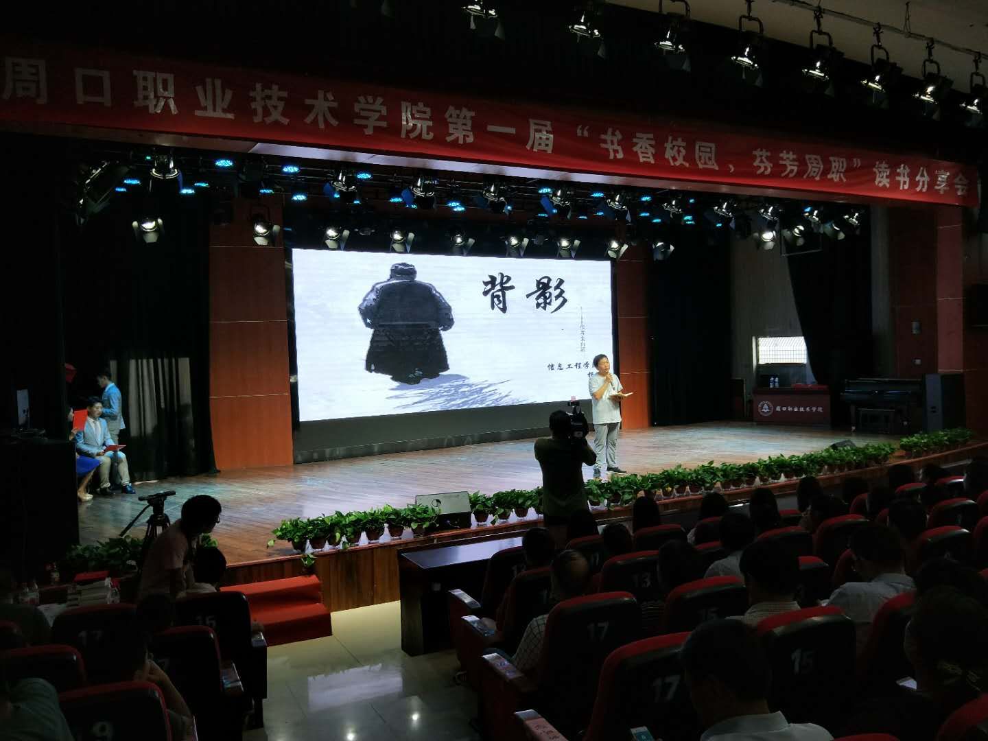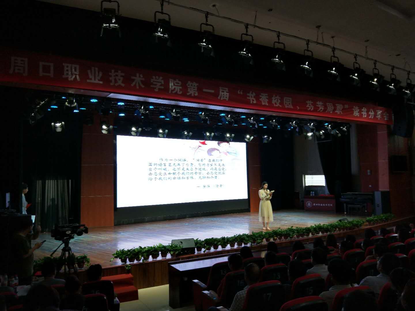大河网讯5月16日下午,周口职业技术学院开展“书香校园·芬芳周职”的读书分享活动,师生代表们聚集在报告厅内,一起分享读书心得。本次活动旨在让读书成为习惯,让书香飘满校园,让学生远离手机,让大家重读经典,点燃周职在校大学生的读书热情,鼓励每个人去发现阅读的快乐。