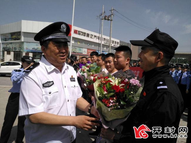开封网讯 全媒体记者沈泓琳报道 掌声送勇士,鲜花献英雄,5月23日上午,市公安局在连霍高速开封站举行隆重仪式,欢迎押解犯罪嫌疑人自长沙返回的侦查英雄们。经过3个多月的不懈努力,开封市警方终于侦破“2018·2·9”特大电信诈骗案,成功抓获嫌疑人89名,犯罪团伙各层级被全部端掉。