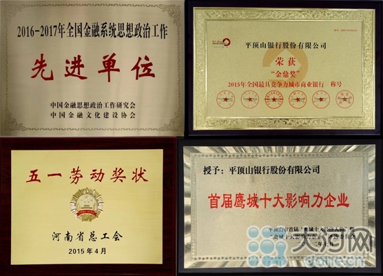 十年甘苦行,众志写丹青。近几年在全行上下的共同努力下,全国银行业文明规范服务示范单位、全国工人先锋号、全国城市金口碑服务银行、全国金融系统思想政治工作先进单位、全国最具成长潜力城市商业银行、全国最佳中小企业服务奖、全国巾帼文明岗、河南省先进基层党组织、河南省五一劳动奖状、河南省服务名牌、平顶山市五一劳动奖状、鹰城十大影响力企业、规模效益五十强企业、履行社会责任优秀企业等一系列重量级荣誉接踵而至。