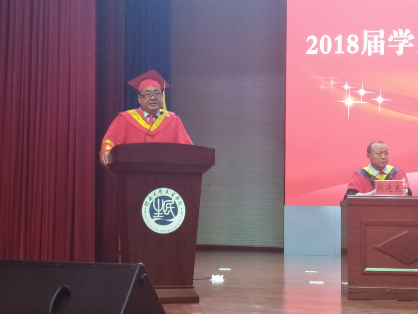 王庆礼在毕业典礼上发表致辞,在表达了自己对2018届毕业生美好的祝福后,为他们做了最后一次“传道受业”,他说,习近平总书记用宋代词人辛弃疾的几句话,“乘风好去,长空万里,直下看山河”,来冀望新时代的青年放飞青春梦想,勇接使命担当,创造不休勋业。即将毕业的他们,有人会选择继续驰骋科研之路,有人选择在国家重点行业建功立业,有人选择到条件艰苦的地方奉献青春才华,有人投身军营去圆自己的军人梦想,无论选择哪条有意义的人生道路,都要坚定自己的理想信念,要懂得珍惜,要学会适应,要不懈奋斗。