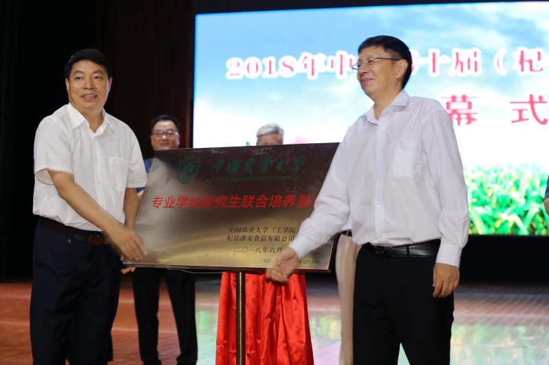县委副书记、县长宗家桢与中国农大工学院副院长李海涛共同为"中国农业大学专业学位研究生联合培养基地"揭牌。