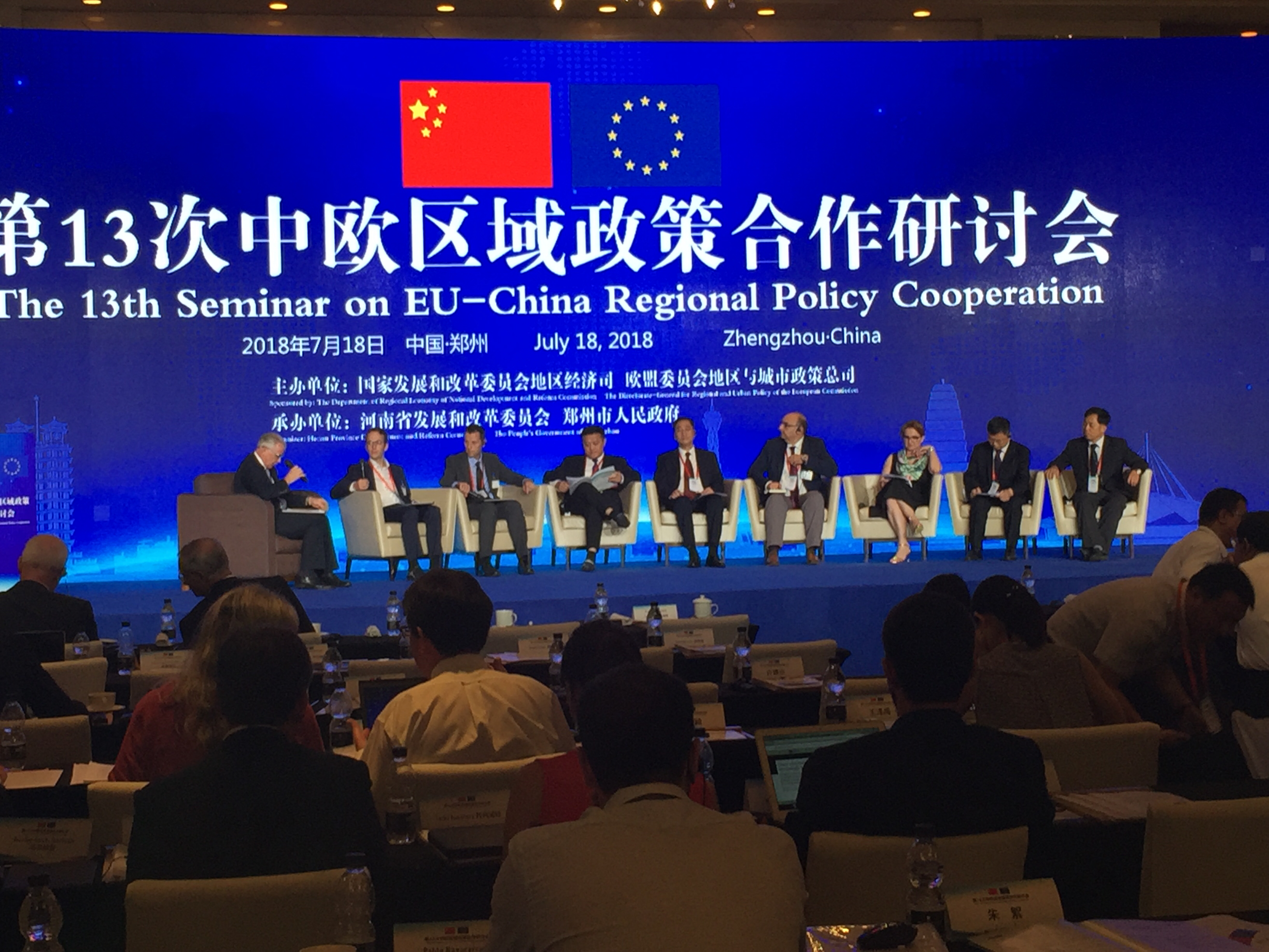 大河网讯 7月18日,由国家发展改革委地区经济司和欧盟委员会地区与城市政策总司联合主办,河南省发展改革委、郑州市人民政府承办的第13次中欧区域政策合作研讨会在郑州召开。国家发展改革委地区经济司司长郭兰峰,欧盟委员会城镇政策总司顾问霍尔先生,欧洲议会地区委员会协调人范尼斯特鲁奇先生,欧洲议会地区委员会城镇组主席欧布瑞奇先生,郑州市委常委、常务副市长王跃华分别致辞。会议就如何实现区域创新和推动区域经济高质量发展进行了深入探讨和交流。
