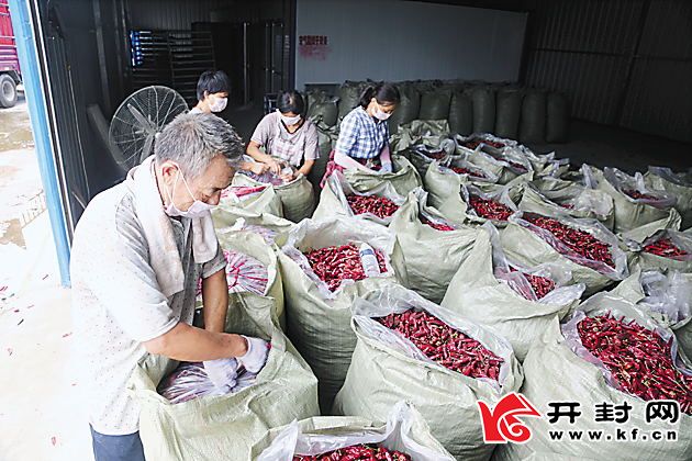 杞县裴村店乡吴起城村通过发展辣椒产业种植和加工,带动了一批贫困户实现顺利脱贫。图为该村村民正在对烘干辣椒进行打包。 全媒体记者 汪少冲 摄