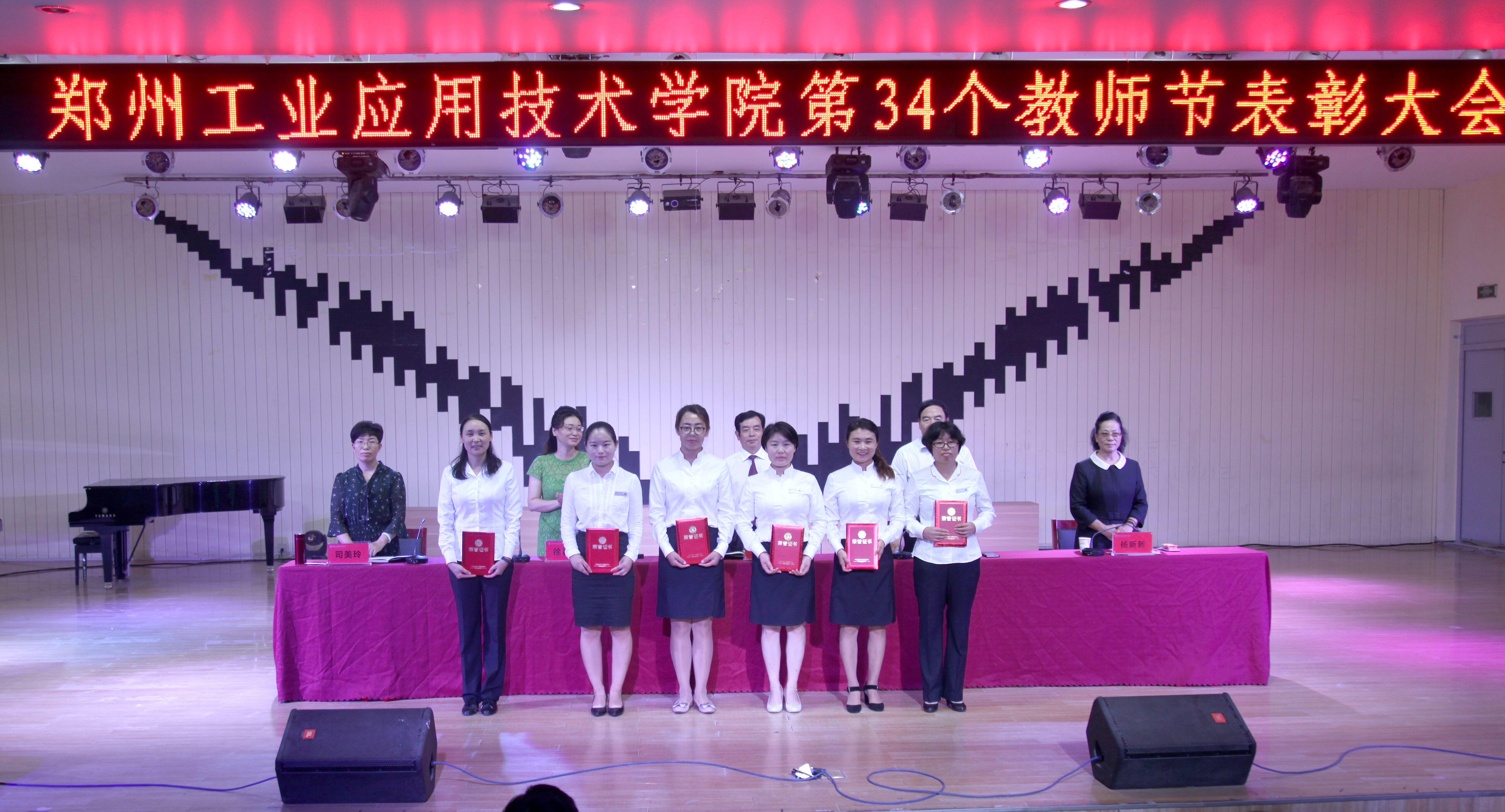 会上,副校长徐春华宣读了《郑州工业应用技术学院关于表彰2017-2018学年度优秀教师、优秀辅导员和先进教育工作者的决定》;副校长杨新新宣读了《郑州工业应用技术学院关于表彰2018年“不忘初心,立德树人”师德主题教育活动获奖个人的决定》。在欢快的音乐声中,与会领导为获奖代表颁发了证书。