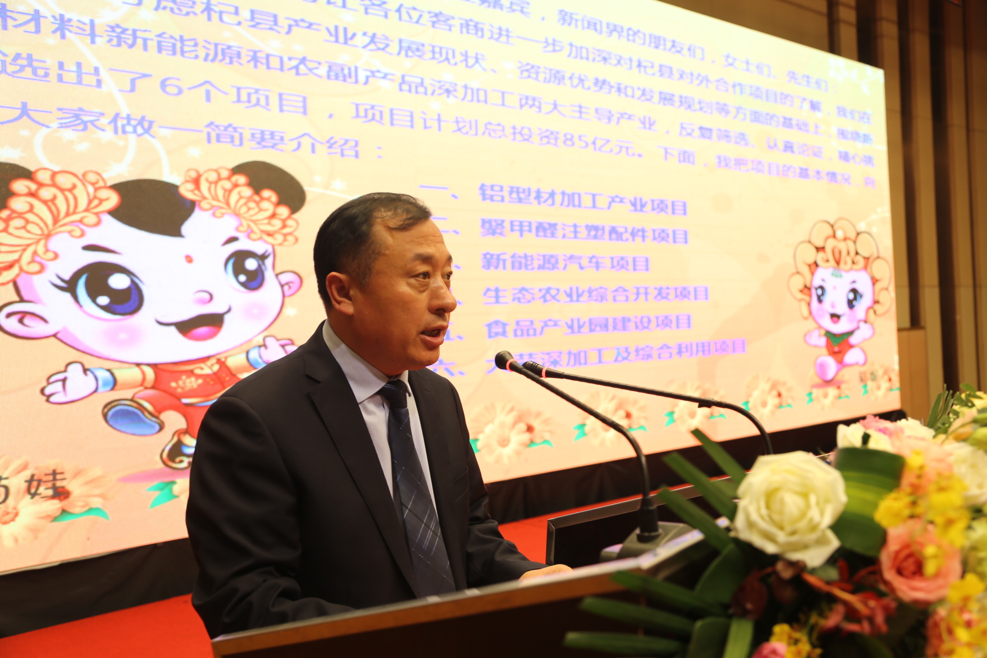 县委常委、常务副县长、政法委书记张富存做项目推介,对精心挑选出市场前景好,涉及铝型材加工产业、聚甲醛注塑配件、新能源汽车、生态农业综合开发、食品产业园建设、大蒜深加工及综合利用,计划投资85亿元的6个项目进行了介绍。并欢迎与会客商到杞县进行实地参观考察、投资兴业,共创美好未来。