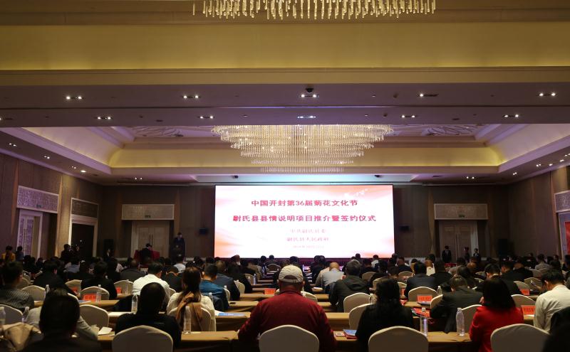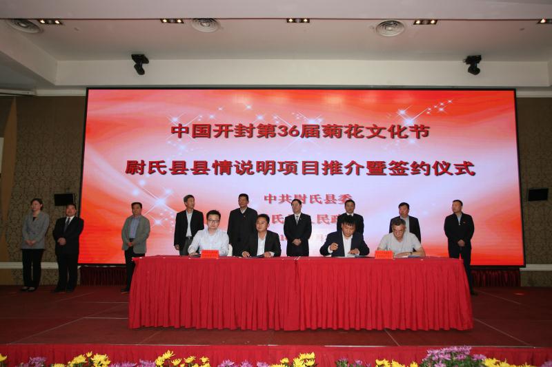 大河网讯 10月22日下午,中国开封第36届菊花文化节尉氏县县情说明项目推介暨签约仪式盛大举行。开封市委常委、市纪委书记、市监察委主任卢志军,市政协副主席苗琛出席推介会,市直有关单位领导,尉氏县四大班子领导韩治群、高玲等与来自国内外的知名客商一同参加签约仪式。