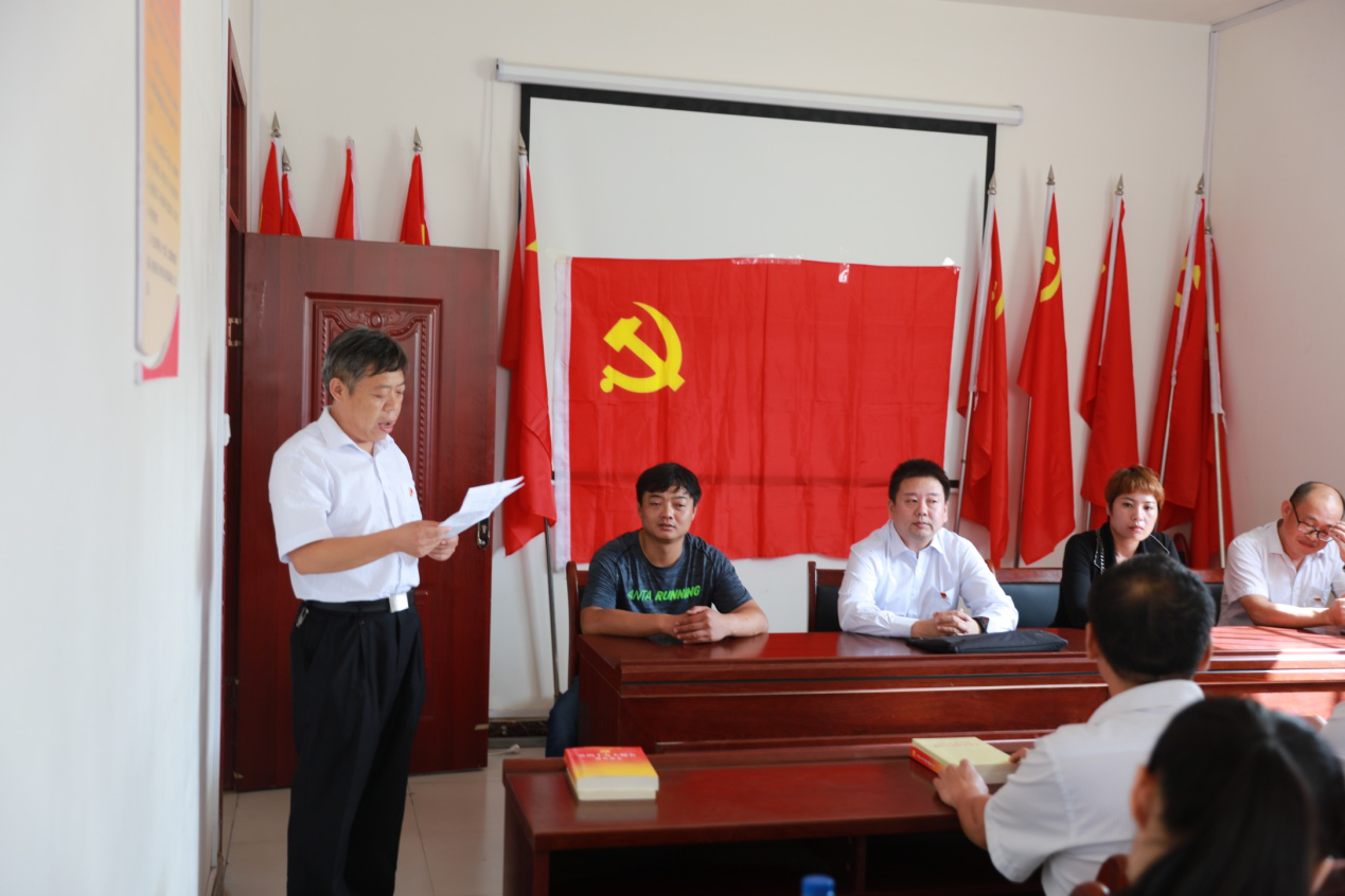 在张吴寨村会议室,刘滨同志为全体党员传达了“5+N”主题党日活动的具体内容,强调开展“5+N”主题党日活动的意义及重要性,随后带领大家紧握右拳,面对鲜红的党旗再次庄严宣誓,重温入党誓词。在诵读经典过程中,刘滨同志结合当前中美贸易战形势,为大家诵读了毛主席的《论持久战》节选,并指出中美贸易战和抗日战争虽然时代背景不同,但同样会是一场持久战,中国也必将取得这场战争的最后胜利。接着,大家为9月份入党的2名党员集体庆祝政治生日,并送上两本党建书籍作为生日礼物。党员代表姜四如同志进行了发言,与大家分享自己重温入党誓词的感受,并回顾了个人入党初心及经历,表达了下一步如何发挥党员表率作用的决心。