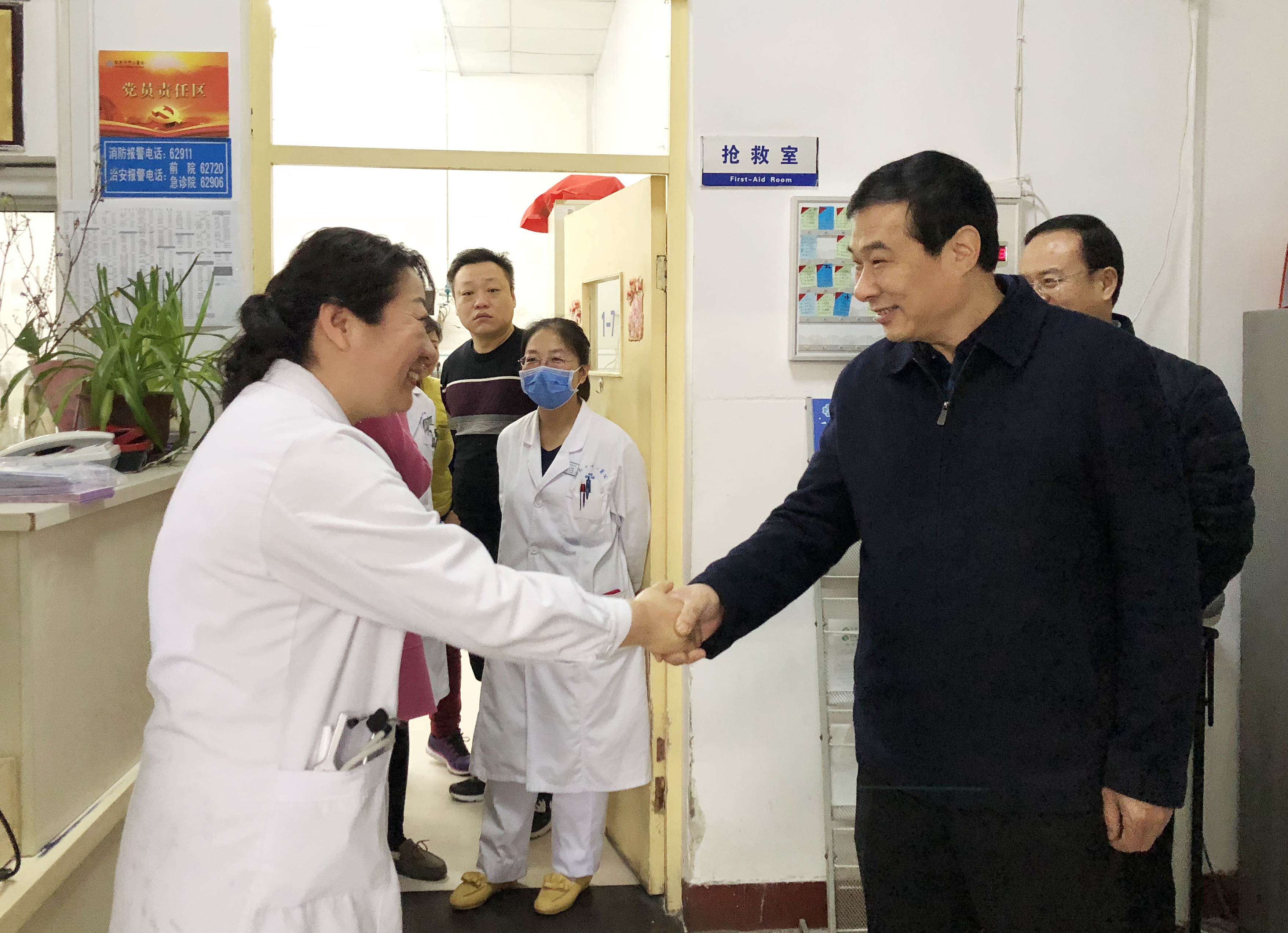 大河网讯 2月11日是春节长假上班的第一天。上午8时30分,开封市中心医院领导刘静宇、周霖、谢文忠带领有关职能科室人员,先后到门急诊、医技、临床和后勤等科室,与在一线的工作人员亲切握手并送上新春的问候和祝福。