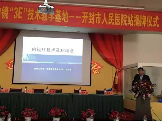 会上,由郑州大学第一附属医院副院长苟建军、开封市人民医院院长崔巍共同为“消化内镜3E技术教学基地”揭牌,同时聘请郑州大学第一附属医院消化内科王红建主任为我院的客座教授,并由崔巍院长给予颁发聘书。崔巍院长表示在今后的工作中,通过与郑州大学第一附属医院的紧密合作,不断提高我院消化内科内镜、疑难病例的诊疗水平,更好地服务于广大群众,为开封市人民提供更优质、便捷的医疗服务。