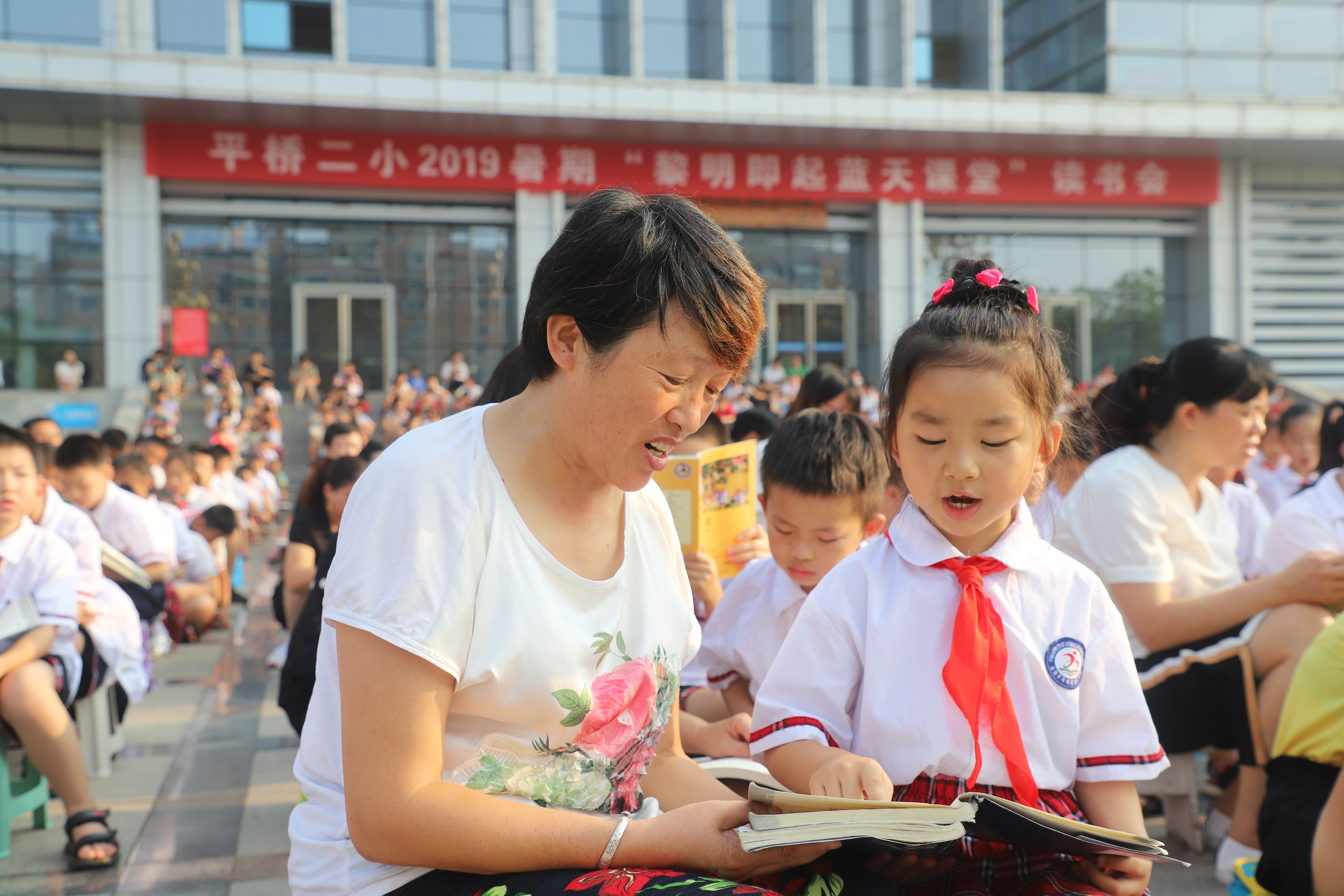 平桥区二小是全国“传统文化项目试点学校”和“全国传统文化基地学校”,去年暑假的蓝天课堂读书活动让学生熟悉了《论语》《弟子规》《大学》等国学经典。今年暑假放假前,一经学校号召,老师们就义务参与领读,自愿参加晨读的学生和家长热情依然不减,家长志愿者踊跃协助维持秩序。