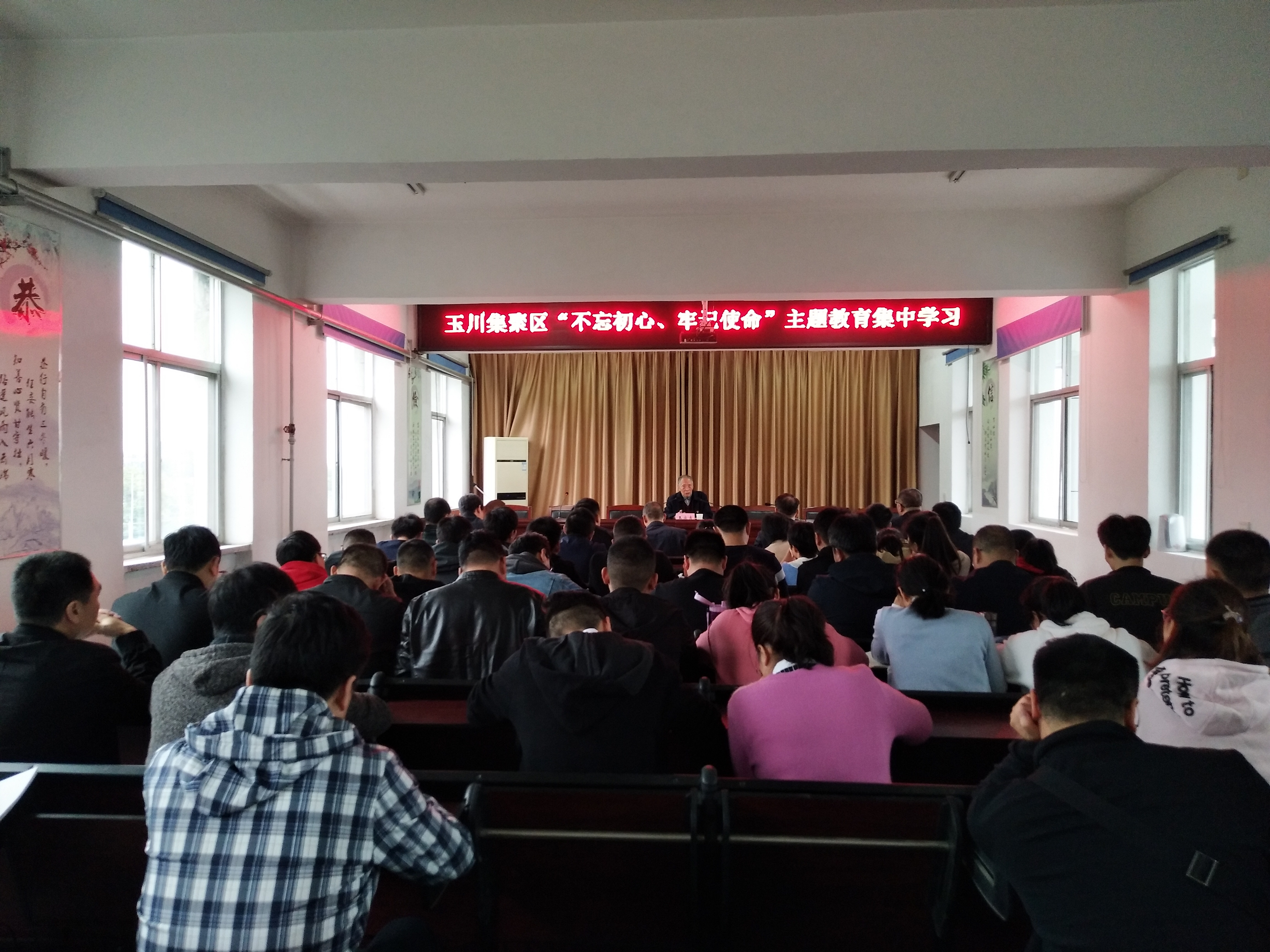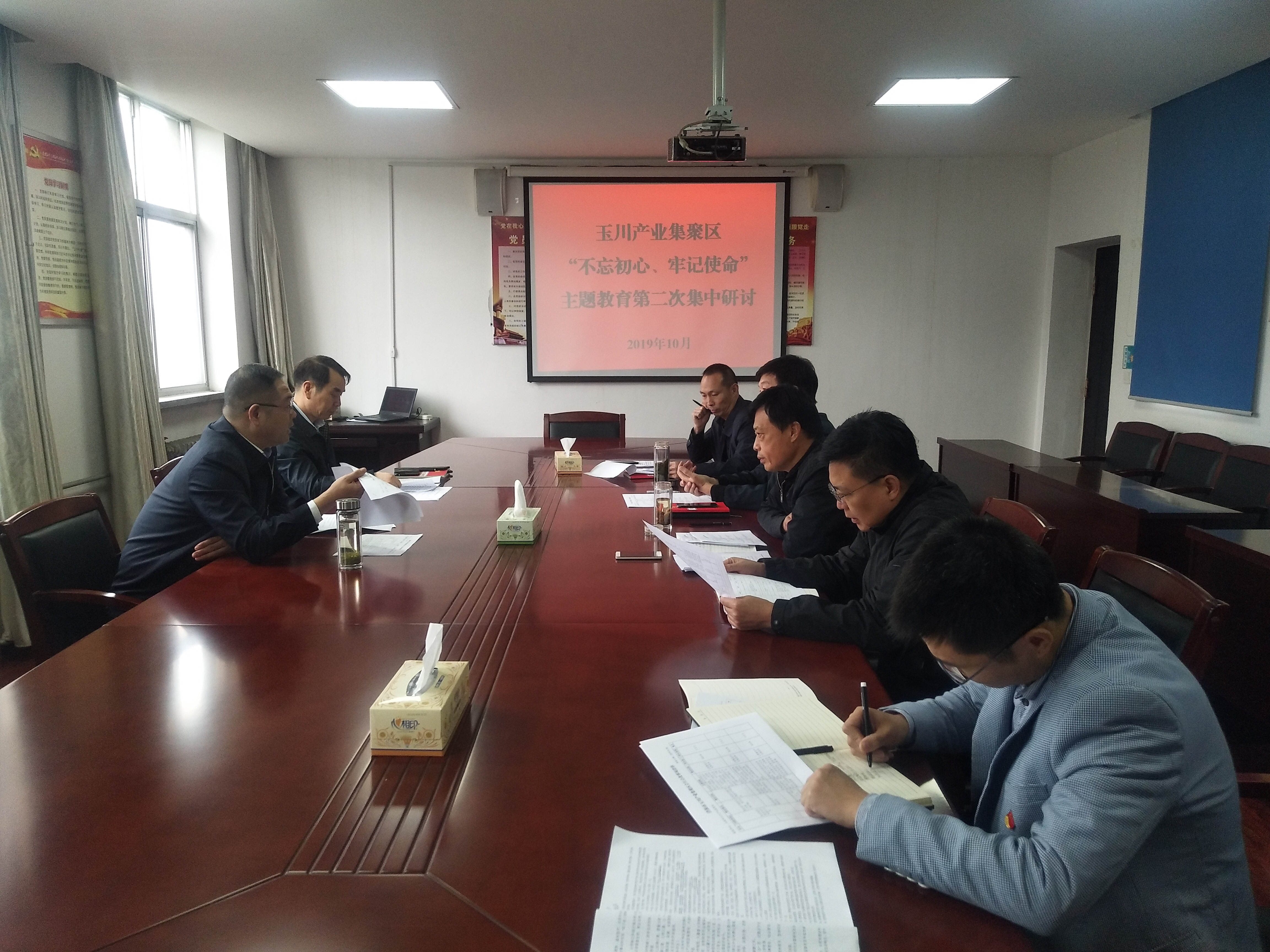10月15日,玉川产业集聚区邀请济源市委党校黄盼老师为全体党员做《不忘初心、牢记使命》专题辅导。黄盼老师从“民族危机与党的创建”、“国共竞争与民族觉醒”、“建国执政与走向复兴”和“民族复兴迈进新时代”四个方面进行了详细解读,使全体党员对中国共产党的发展史和中华民族的伟大复兴有了更深刻的了解,对共产党的初心和使命有了更深的感悟。 集聚区领导班子开展“不忘初心、牢记使命”主题教育第二次集中研讨活动,研讨会上,班子成员以“传承红色基因、牢记初心使命”为主题,展开研讨发言。大家再次集中学习习近平总书记调研视察河南讲话精神,深刻领悟习近平总书记“三个怎么来的”谆谆教导,并对照党的初心和使命,对照革命先烈、英模人物,对照焦裕禄同志“干部十不准”“十多十少”“五个跟不上”等,认真检视差距不足。