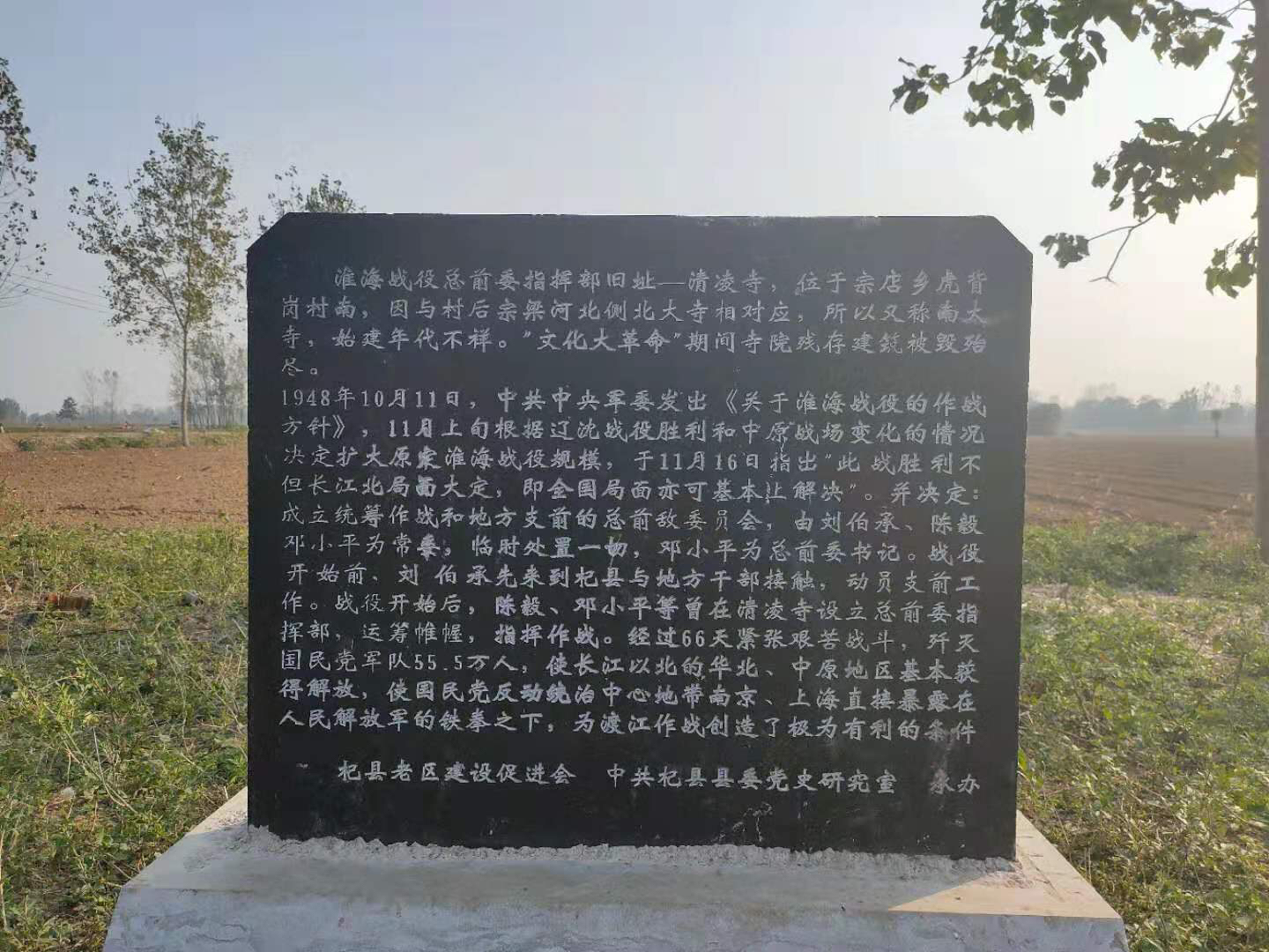 淮海战役总前委华东野战军指挥部旧址仅剩一块残碑和刘伯承作战前动员所站的土台子,见证了杞县宗店虎背岗村在中国人民解放战争的历史上写下了光辉灿烂的一页。华东野战军前委指挥部遗址,是杞县重要的红色教育基地。为保护革命遗址,传承革命精神,启迪教育后代,杞县县委、县政府对虎背岗华东野战军前委指挥部旧址给予认定,本着因地制宜、勤俭节约的精神,在清陵寺旧址上恢复指挥部曾用建筑,收集整理华东野战军前委指挥部有关资料,把华东野战军前委指挥部指挥部虎背岗村旧址打造成杞县青少年红色教育基地,在实现中国梦的征程中让红色基因代代相传。(董伦峰)