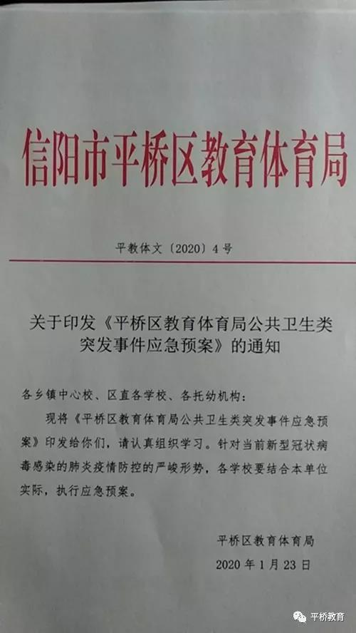 一是加强联防联控。成立疫情防控工作领导小组,召开局党组会和校长会,下发了《平桥区教体局公共卫生类突发事件应急预案》的通知,启动全区教育系统公共卫生类突发事件应急预案和机制,做好疫情防控与处置、舆情应对与引导等预案,密切关注师生发生新型冠状病毒感染的肺炎疫情情况,及时准确掌握信息,积极获取专业指导,做到早发现、早报告、早治疗,确保疫情防控措施落地落实。同时,积极做好高粱店乡路口卡点执勤防控工作。