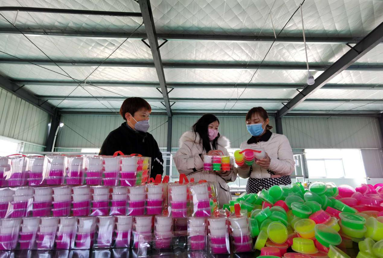 在尉氏县大桥乡冯村产业扶贫车间,村党支部书记段翠荣正在与基地技术员胡丽娟交流水晶泥生产工艺。今年初,该扶贫基地引入水晶泥生产线,虽然因为疫情影响了生产,但由于市场前景好,刚刚开工就接到了订单,让在此务工的群众和贫困户信心大增。