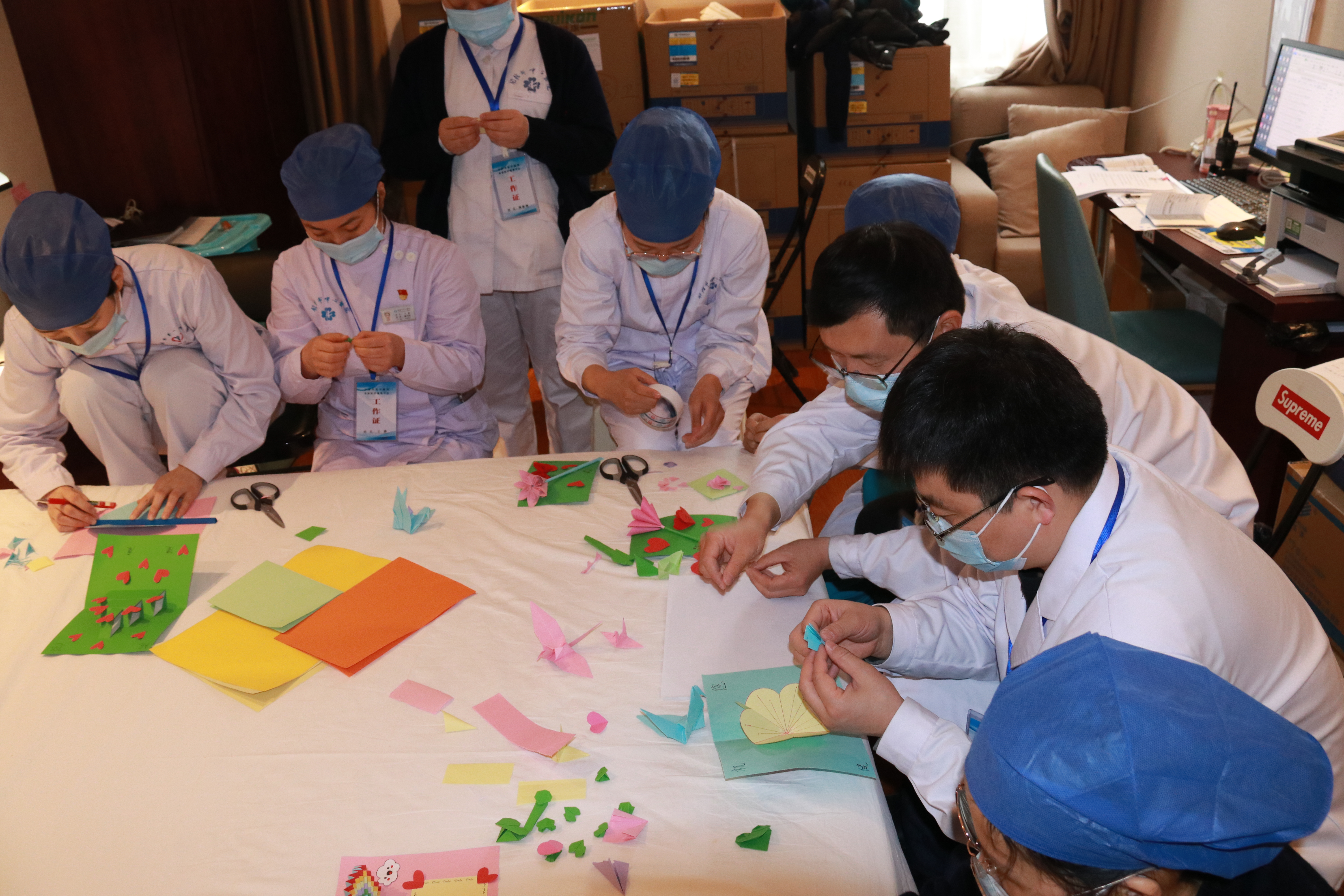 从美国返乡的一对年轻夫妇,带着两个四五岁的孩子。两个孩子活泼可爱,可要在这里观察14天,对于爱玩的孩子来说肯定是一种煎熬。为了让小朋友们感觉到不太无聊,她们亲手制作了小青蛙、千纸鹤、小飞机等纸质玩具。“由于是隔离区,礼物送到房间后,我们接通电话表达我们的心意,交谈中,孩子的妈妈一直向我们表达谢意,孩子们开心的笑声也一直传到我们耳边,那一刻,我们觉得他们的笑声真是世界上最动听的声音!”医护人员说道。