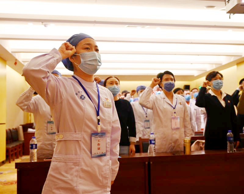 临时党支部书记、医疗队副队长王静同志带领全体党员,面向党旗庄严宣誓,重温入党誓词,在抗击疫情一线增强信心、坚定信念。全体党员和队员众志成城,把力量凝聚在党的旗帜下,让党旗在疫情防控第一线高高飘扬。