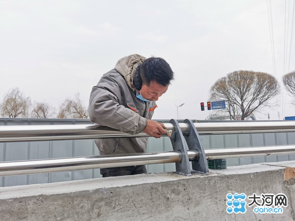 大河网讯(记者 田明杰 通讯员 刘一龙)1月20日上午,在漯河市区泰山路沙河桥南引桥,市政施工人员正在紧锣密鼓地对安装的栏杆进行刷漆修饰,该桥引桥护栏主体安装已完成,进入收尾阶段。
