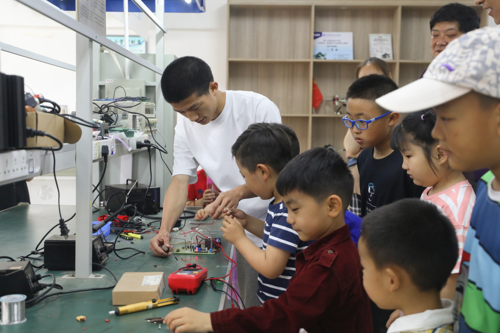 在创新实验室,在全国机器人大赛及“恩智浦杯”智能车大赛中获奖的哥哥们为他们演示了亲手制作的跳舞机器人和智能车,并且为他们介绍了如何用3D打印机打印出栩栩如生的小动物;在图书馆,孩子们在智慧阅读空间驻足良久,亲手操作了智慧屏;在医学院实验室,孩子们参观了模拟育婴室、分娩室、模拟病房。医学院教师邝雨洁不仅详细讲解了人体结构及医学和护理知识,而且为他们演示了医疗器械的操作;在艺术学院教室,书法专业的哥哥姐姐教小朋友们写书法,并且书写了六一节祝福送给他们;在传媒学院演播厅,在传媒学院教师杨申正的指导下,孩子们当了小主持人,为全国小朋友送上了美好祝福;在体育场,体育教师们教孩子们踢足球,还为他们讲解了游泳的要领。