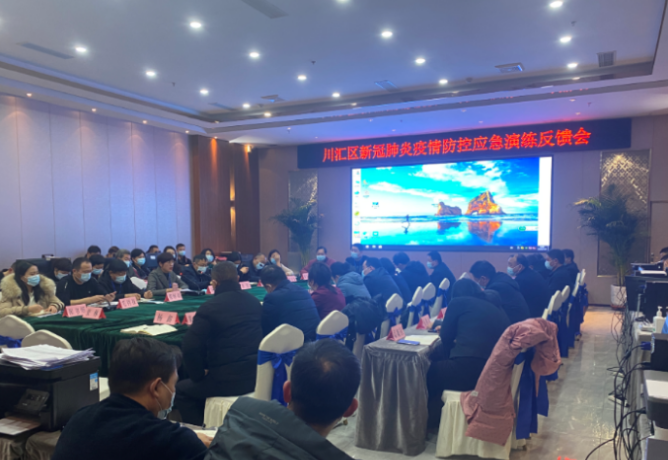 大河网讯 1月5日上午,周口市川汇区区长胡友涛主持召开新冠肺炎疫情防控应急演练反馈会。市卫健委党组成员、副主任王文灵、李波,区领导李嫣、杨敏、王艳、巴兵、李炜、朱成刚、杨鑫、马淮海出席会议,市疫情防应急演练控评估组,各街道办事处、区直相关单位负责人参加。