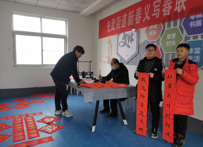 活动现场,书法爱好者们挥毫泼墨,挥毫书写春节楹联。春联内容有“书声琅琅传天下,诗意浓浓道古今”“扫黄打非树新风,激流扬清促文明”“扫黄打非气氛浓,新春送福墨飘香”“不忘初心行大道,更怀壮志奔前程”“扫黄打非进万家,绿色文化人人夸”“多读好书扬正气,远离黄毒扫歪风”等,一副副蕴含着浓浓年味儿、传递着满满祝福和“扫黄打非”的大红春联,让居民纷纷争相领取。