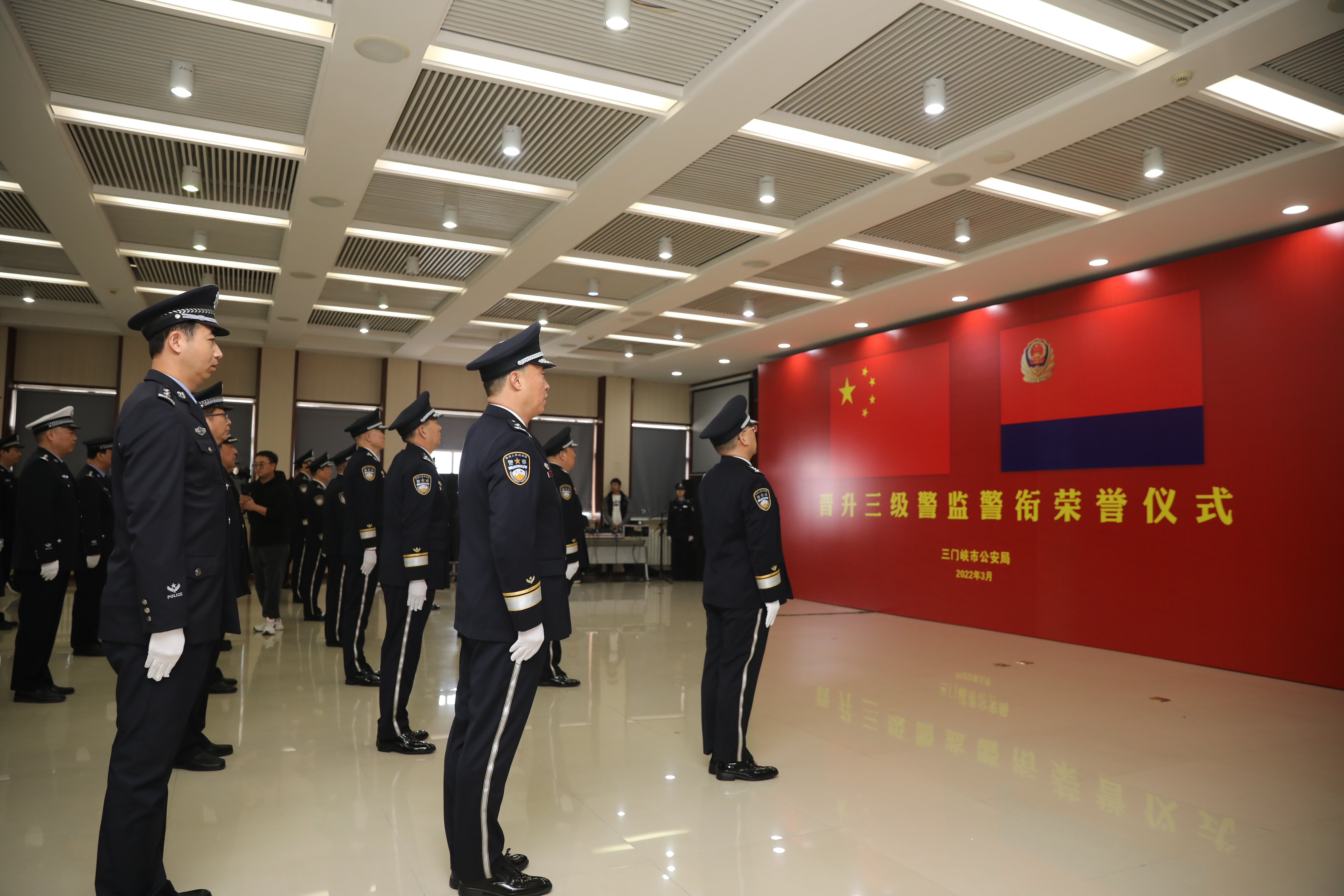 三门峡市公安局南六楼会议室前方背景板上,“晋升三级警监警衔荣誉仪式”十二个大字格外醒目,中华人民共和国国旗、中国人民警察警旗交相辉映,参加仪式的6位高级警官身着警礼服,精神抖撒、英姿飒爽,同战友们整装列队。