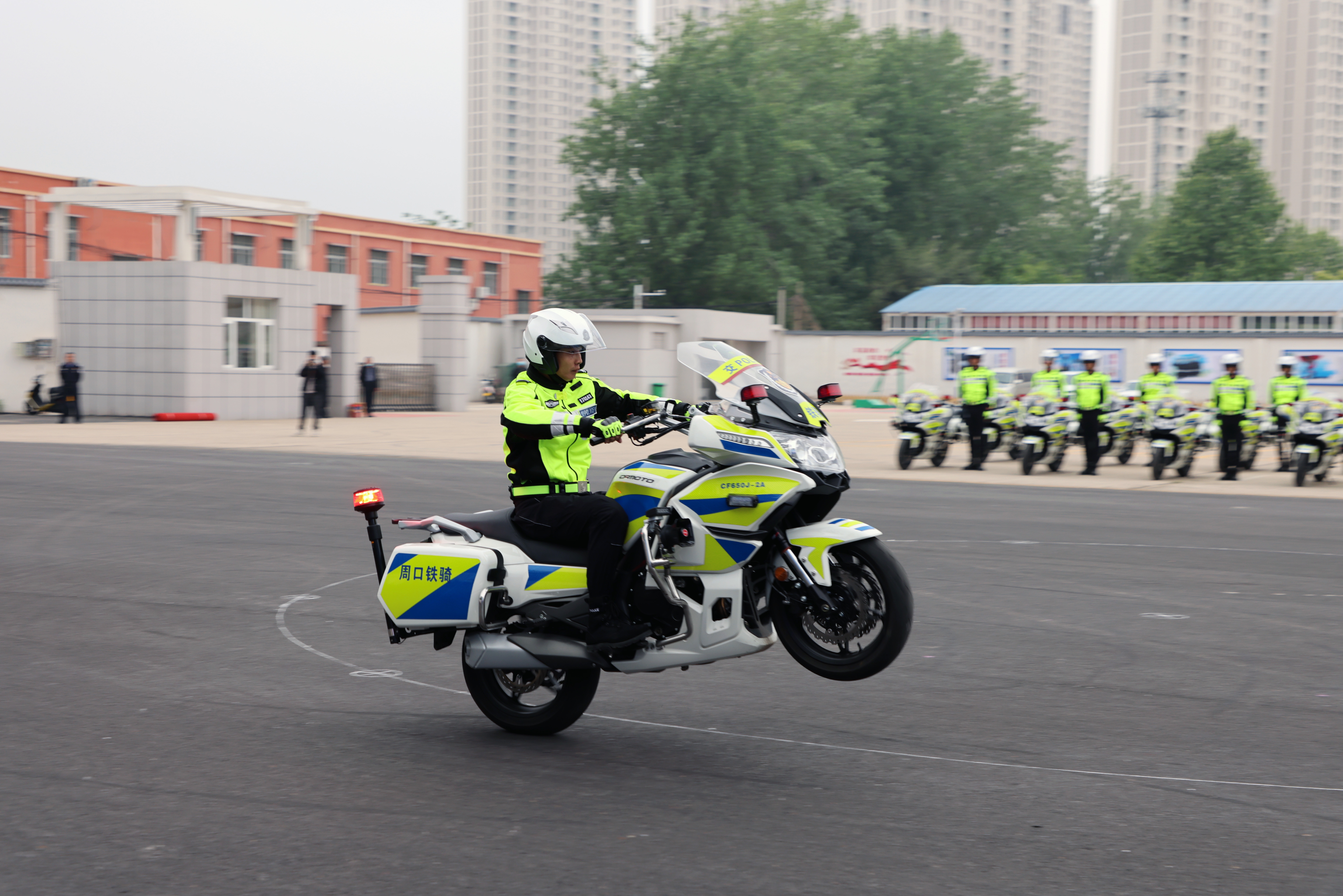 9时15分许,伴随着摩托车的轰鸣声,铁骑队员们进行了双人同步绕桩、双人对向绕桩避险、四人同步绕桩、双人对向定圆绕桩、驾驶摩托车行进敬礼、摩托车多种编队展示等精彩的摩托车特殊技能演示,赢得现场掌声连连。