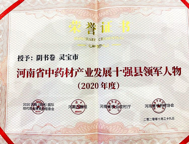 2020年10月29日,在2020年河南省中药材产业创新发展高峰论坛中,阴书卷获“2020河南省中药材产业发展十强县领军人物”称号、河南鑫浩优质中药材良种繁育和生产示范基地获“2020河南省中药材产业发展十强县示范基地”称号。