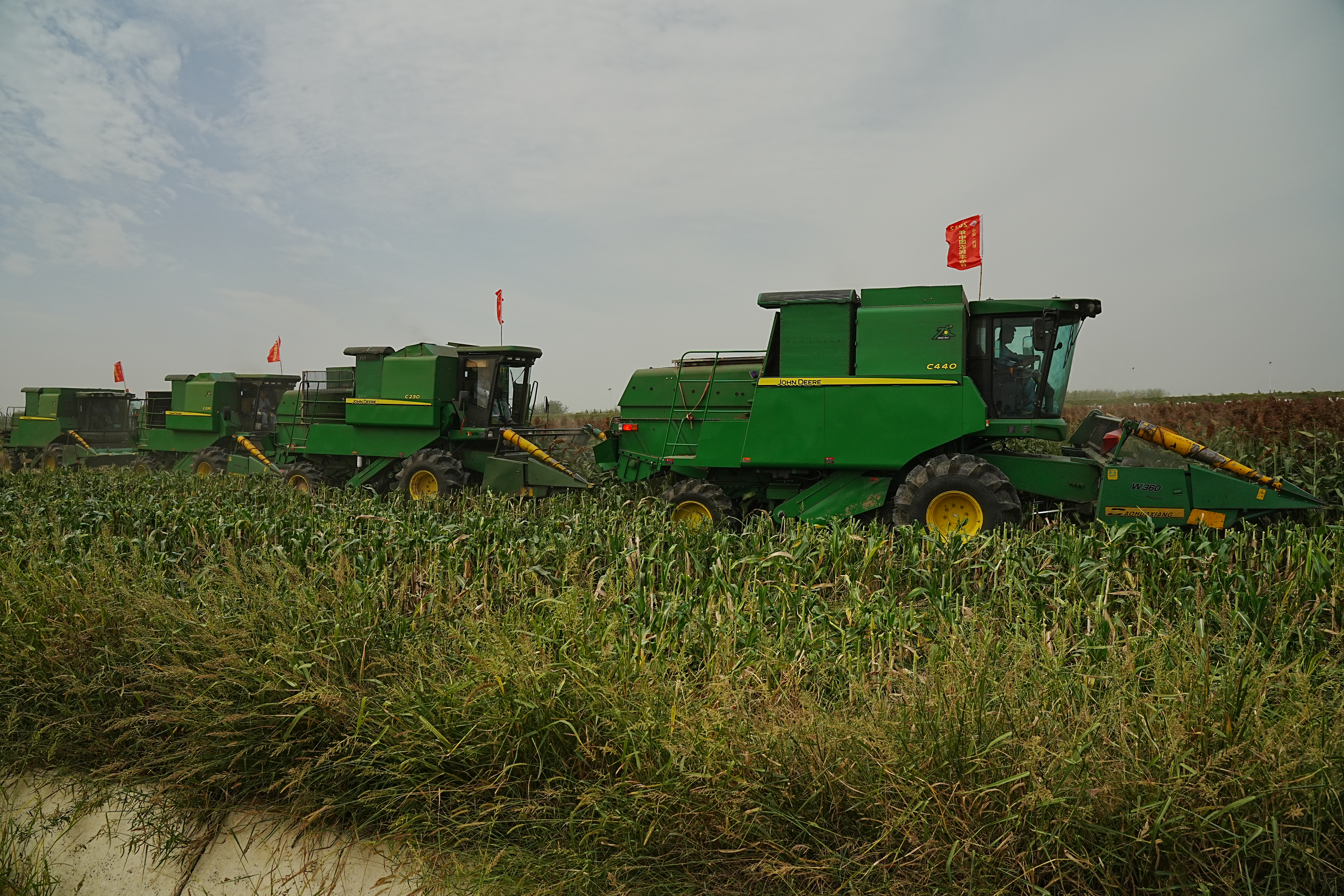 万亩高粱穗,映红丰收年。走进固始县万亩高粱种植基地,一穗穗颗粒饱满的红高粱压弯了腰,随风摇曳,远远望去一片火红。伴随着“隆隆”的轰鸣声,六台大型收割机来回穿梭在田野里“吞”进高粱穗,“吐”出粒粒高粱,一茬一茬的高粱秆转眼间就变成青肥撒在田间。