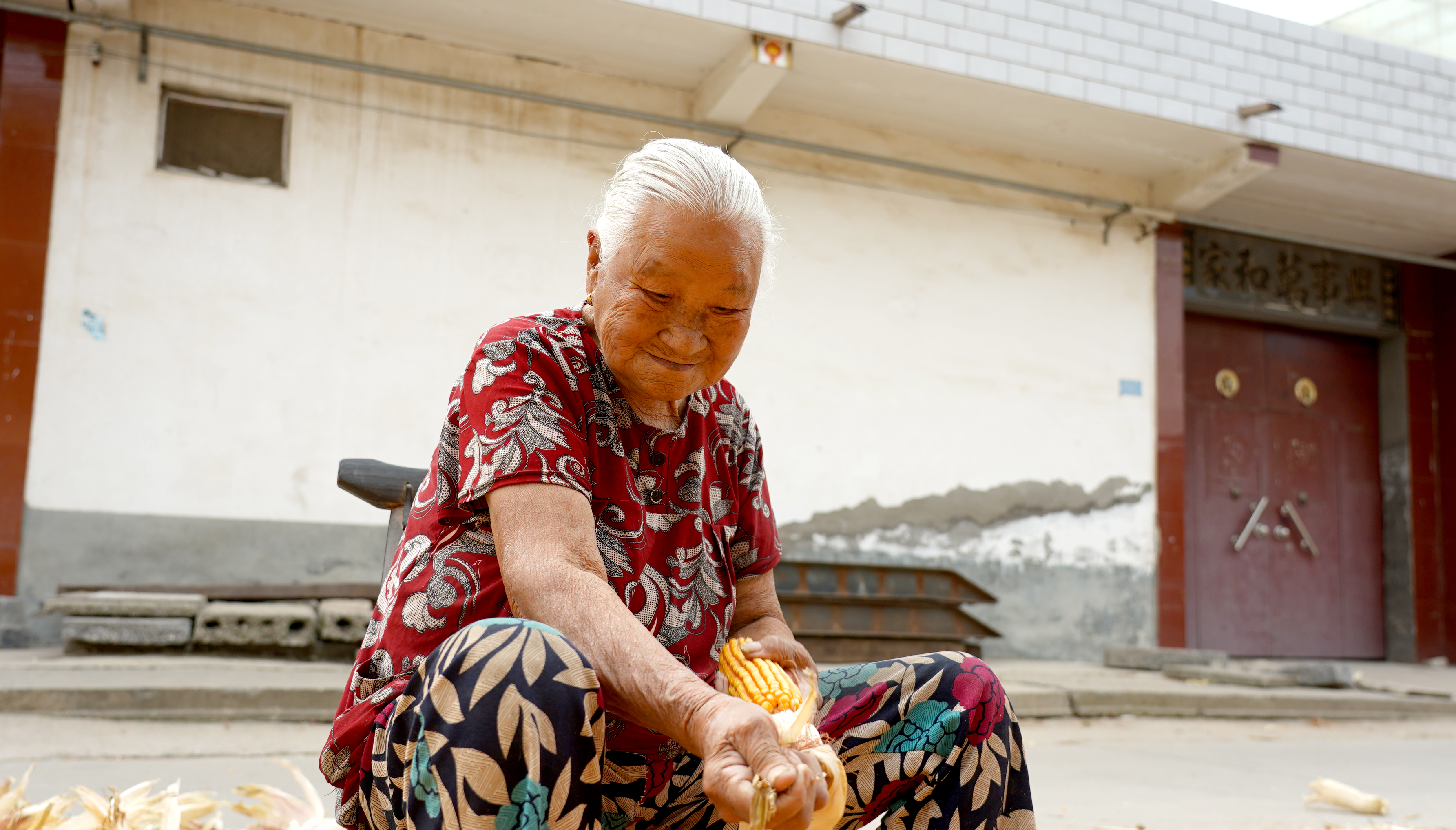 一家三口正在剥玉米,银发奶奶正用力拔去玉米包叶。