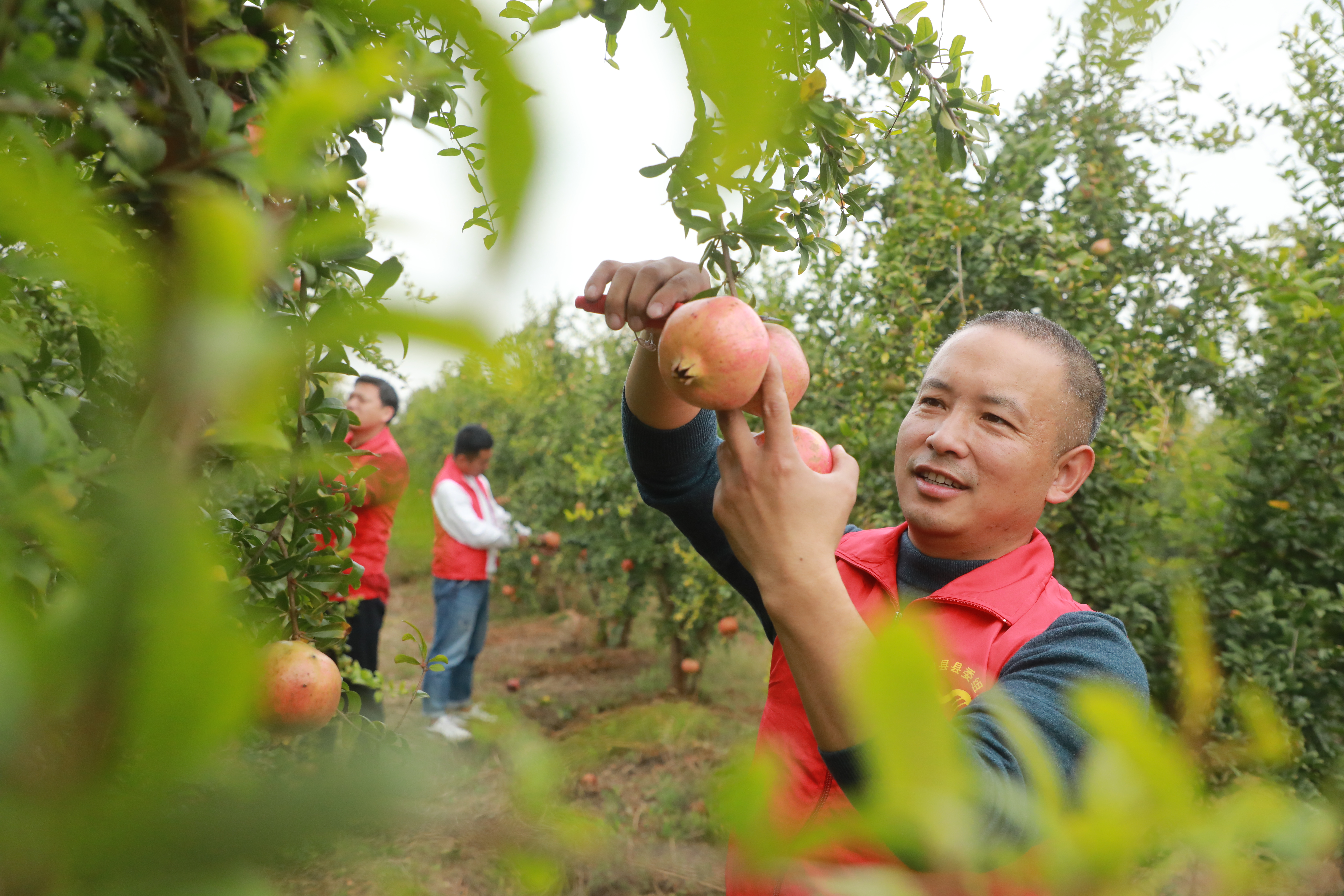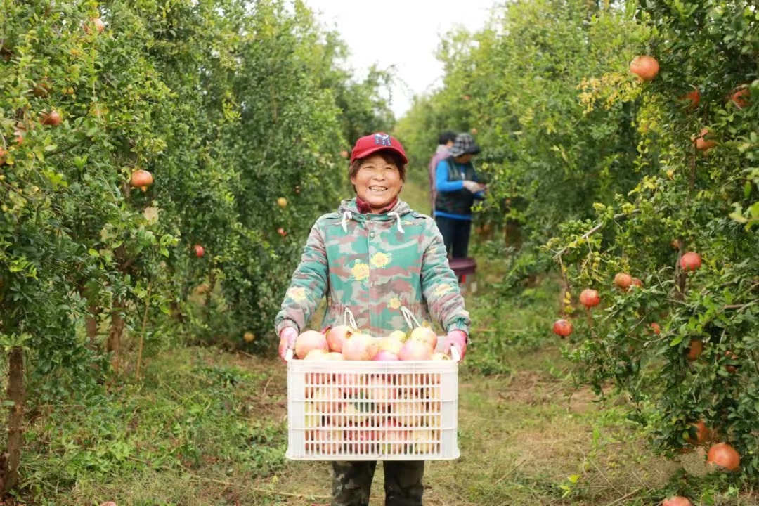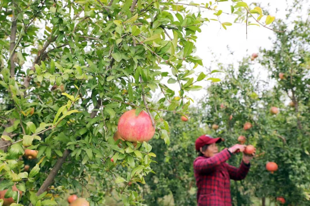 石榴园内,果农们、工人们忙着采摘、选果、套袋、装箱,目之所及,一派人来人往的繁忙景象。