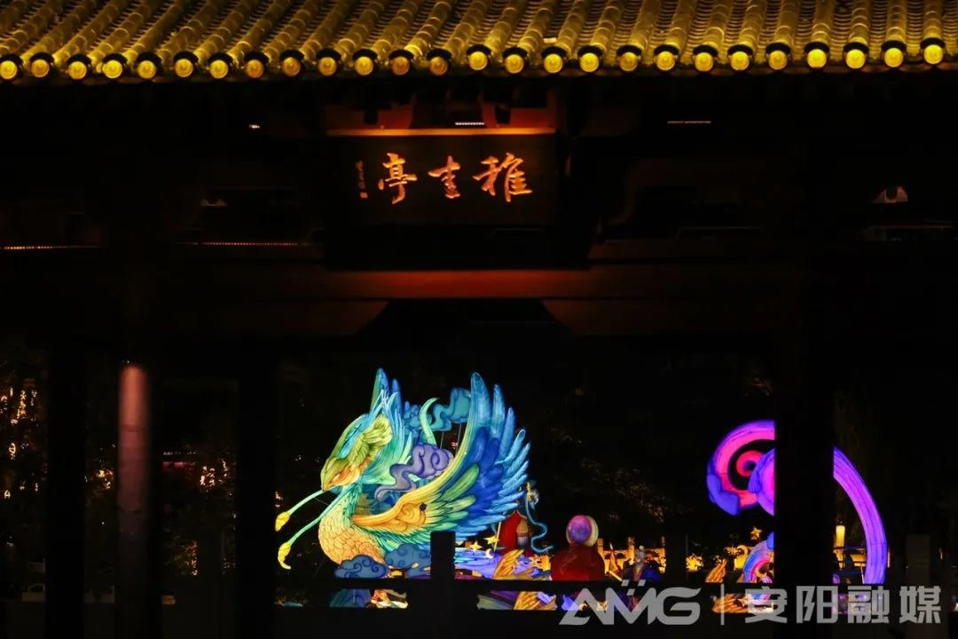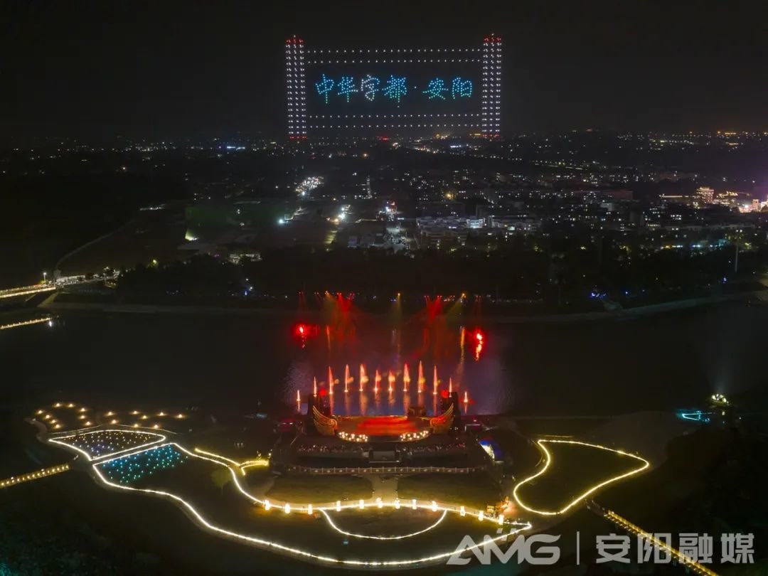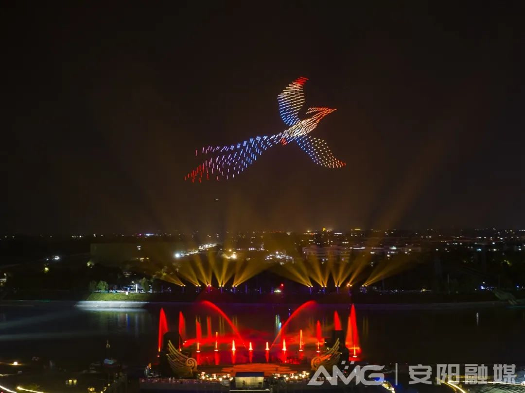 中华字都·安阳“洹河夜游”活动开启至今,每晚,洹河月亮岛上空都会上演时长约20分钟的无人机灯光秀。灯光秀以“中华字都·安阳”为主题,以安阳的人文历史、特色建筑等为主要内容,配合灯光和音乐,画面丰富、创意十足。