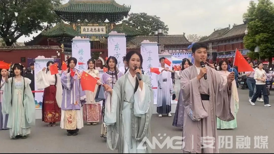 10月1日上午,一场名为《云裳花容》的古装秀在岳飞纪念馆门前展示,各式各样的古装吸引了不少游客驻足观看。南侧的红色阁楼上,“背诵《满江红》 免费游岳庙”也正在进行,“三十功名尘与土,八千里路云和月……”,古诗词与古装秀相得益彰,让游客仿佛穿越千年。