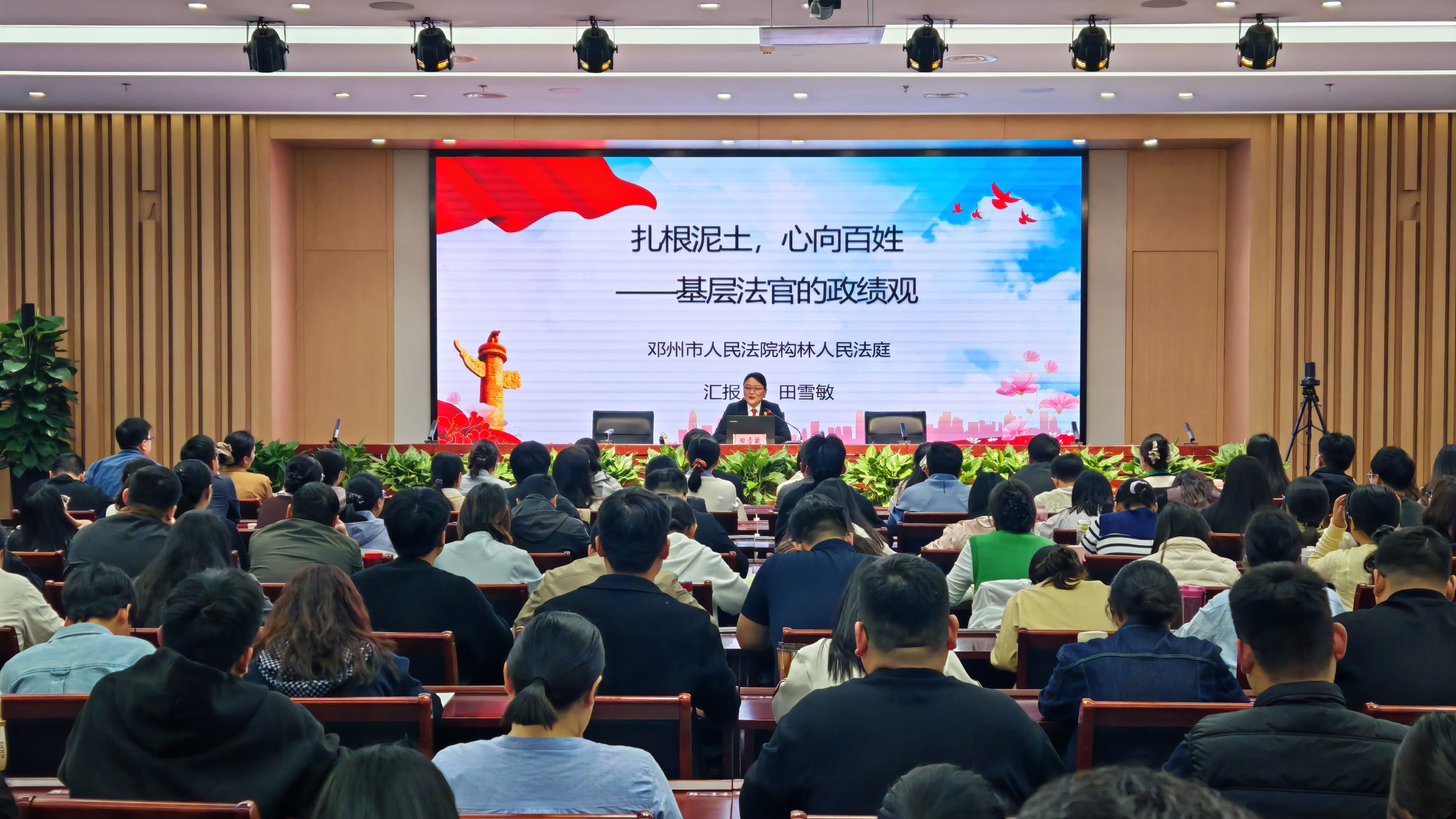 授课中,田雪敏结合自己十几年的基层法院工作经历,通过真实案例、PPT图片和视频等方式,用一张张现场照片、一段段办案视频和一个个真实案例,串联起她对基层法官政绩观的理解。她从三个方面娓娓道来:党建领航,心里有盏灯;服务大局,火线敢冲锋;用心用情,案结人更和。她讲述了“三下农田”化解土地权属纠纷、妥善处置涉众型纠纷、为下落不明当事人多方联系促成调解等办案经历。她说,基层法庭处理的多是邻里纠纷、家庭矛盾、借贷欠款,算不上大案要案,但每一件都关系老百姓的切身利益。法官的政绩,不在一年办了多少案子,而在化解了多少矛盾、修复了多少关系。
